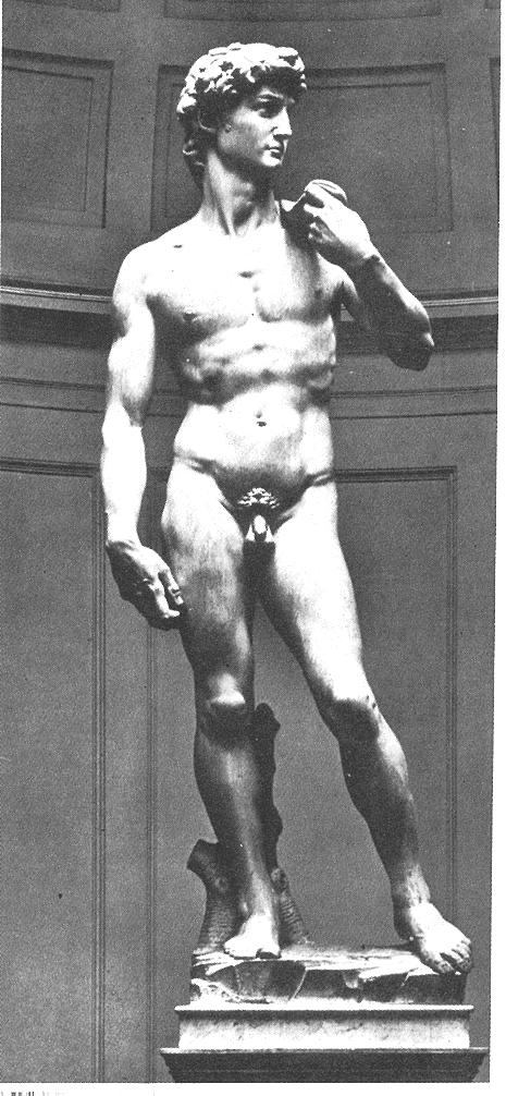 2.[大衛像]-希臘即有大衛的傑出裸像,本件作品係麥迪其家族委託米開朗基羅製作,但反被為視為反抗獨裁(即反麥迪其家族),並為共和的象徵,為真理而挑戰;可謂希臘雕像的傳承,據說有四至