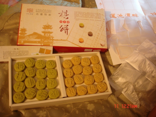 棋 餅:成份是綠豆糕,下棋時戴著乾淨手套來玩,吃到對方棋子時,可以直接放入口中吃掉(所以棋只能下一次),贏得愈多,吃得愈飽;不過輸棋時,千萬別摔棋子或掀棋盤,自己趕快吃自己(的棋子)就好了。