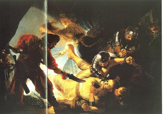 1.[刺瞎參孫],參孫力氣大的秘密被妓女達利拉套出來,原來是得自於頭髮,所以達利拉偷剪他頭髮;光影對比效果
