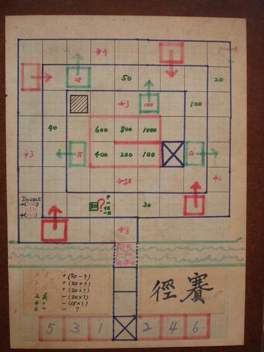 請注意,要進入最後的六格獎金前,必須先剛好在斜線格及打叉格停留,才能繼續往前走,所以很不容易,同時先到先拿獎金的,不一定拿到最多錢,因為最慢到的可能在外面已經吃飽了,或是最後一骰就是6,壹千元!所以,簡單的一張畫格紙,貼在木板上,其中樂趣變化可真不小。