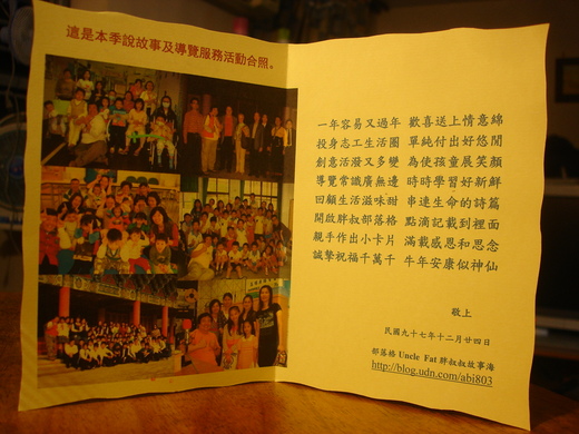 「一年容易又過年,歡喜送上情意綿;投身志工生活圈,單純付出好悠閒;創意活潑又多變,為使孩童展笑顏;導覽常識廣無邊,時時學習好新鮮;回顧生活滋味甜,串連生命的詩篇;開啟胖叔部落格,點滴記載到裡面;親手作出小卡片,滿載感恩和思念,誠摯祝福千萬千,牛年安康似神仙」。