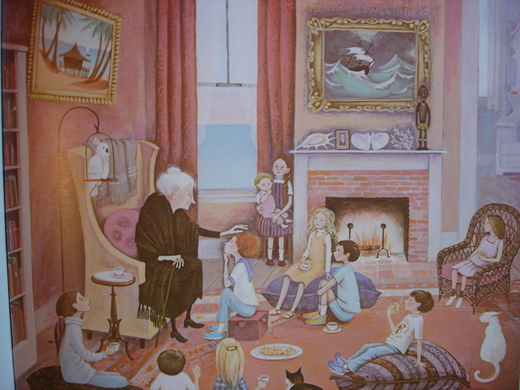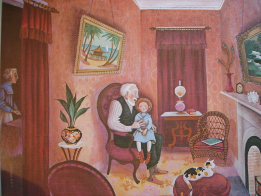 花婆婆真正的名字是艾莉絲,她個子小小的,在她還是小女孩的時候,也是住在海邊的城市,從她家門口的石階上,就可以看到碼頭和船,她知道她爺爺當年就是搭著船來美國的。艾莉絲小時候,她爺爺開了一間雕刻及繪畫店,他會雕刻船頭的人像和印地安人像,也會畫帆船和沿海風景畫,艾莉絲會幫忙畫幾朵白雲。到了晚上,艾莉絲常坐在爺爺大腿上聽他說到遠方旅行的故事,她對爺爺說:「我長大後要像你一樣去遠方旅行,老了也要住海邊。」爺爺笑著說:「很好,但還有第三件事要記得去做,就是做一件讓世界更美麗的事。」