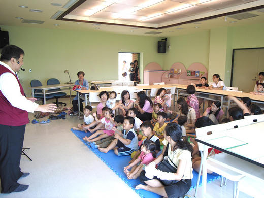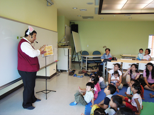 有些人說故事時,不時望著繪本看,以幫助記憶或乾脆邊看邊唸,因此如果是拿在手上,頭就常歪著看;如果是放在膝上,頭就常低下來倒著看。