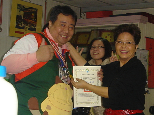 我今天領獎時穿的服裝很特別(或說是有些誇張),因為我把四種志工制服依序都穿上去(志工制服不需花錢購買,不但省掉置裝費,又代表榮譽,所以我要把主要代表的志工服都穿在一起),第一件粉紅長袖的是圖書館故事爸爸,第二件白色短袖是天主教故事魔法屋,第三件菊紅色背心是孔廟導覽志工,最後,最外面的一件綠色圍裙是兒美館故事志工。