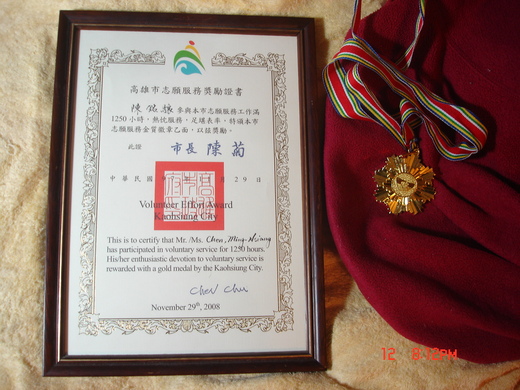 高雄市志願服務協會的許總幹事惠美女士為我頒發奬勵證書、再戴上金質徽章,並一起合影留念。許總幹事是推動志願服務法立法的重要推手,正因為有她和許許多多有心人士的努力,終於使得從事服務的志工們獲得更多制度化的保障和福利,同時總幹事也致力讓高雄市志工的能量連結觸角擴及至國際資源,就在今年即有一項大型的國際志工大會將會選定在高雄市舉辦。