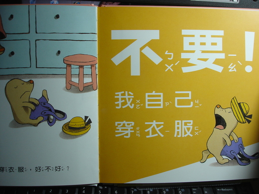 擦乾了頭,米米拿著吊帶褲就往外跑,媽媽追出來:媽媽幫你穿衣服,好不好?米米怎麼說:不要!我自己穿衣服。米米又拉,又扯,又套,又掛,又頂…就是穿不進去,好不容易,ㄟˊ不知道怎麼弄的,一下子穿進去了!米米得意地用鼻子頂著帽子,開心極了!
