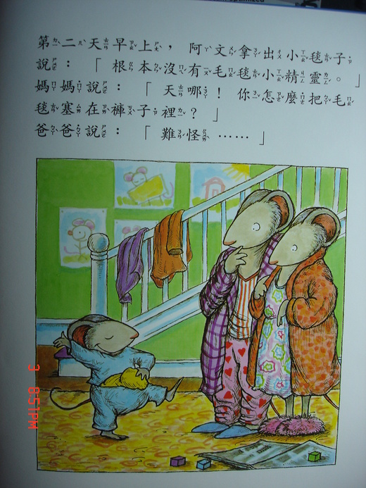 結果,阿文在睡覺的時候,把小毯子塞進褲子裡(為什麼呢?)第二天早上,阿文從褲子裡拿出小毯子,跟爸媽說:「根本沒有毛毯小精靈!」媽媽說:「天哪,你怎麼把毛毯塞在褲子裡?」爸爸說:「難怪…」(OS:找不到!)