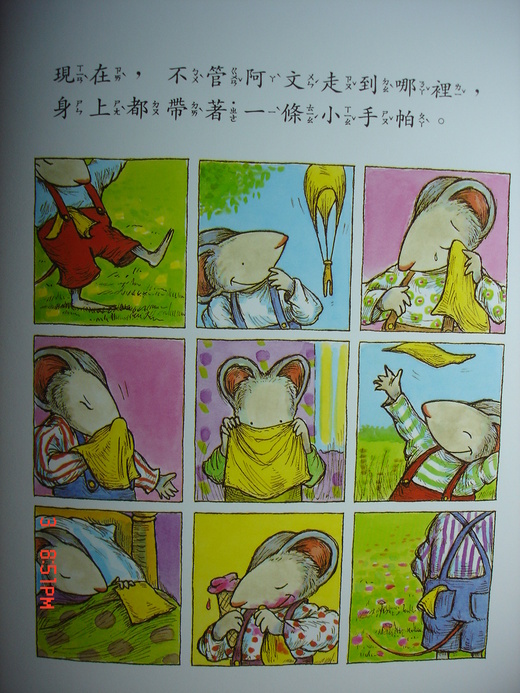 小老鼠阿文從小寶寶的時候就有條黃色小毯子,阿文不管是上廁所、上樓梯、在家裡、在外面、吃東西,還是玩遊戲,他一定帶著小毯子,阿文總是說:「我去哪裡,小毯子就跟我去哪裡。」阿文的媽媽有時會拿著沾到好多顏色的小毯子,發現上面有好多味道(你猜是那些東西的味道?)哇,有橘子汁、葡萄汁、巧克力、牛奶、冰淇淋、花生醬、蘋果醬還有蛋糕!阿文總是說:「我喜歡的東西,小毯子都喜歡。」