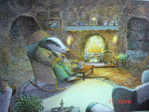 那一天晚上,獾在寫完信以後,坐在壁爐前的搖椅上,搖啊搖著就睡著了,沒想到,他做了一個好美的夢。他夢到他竟然在長長的隧道裡跑著,也不需要拐杖,愈跑愈快,甚至在空中又轉又滾,都不會撞傷,好自由哦,他不再需要他的身體了!