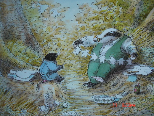 冬天來了,晚上土撥鼠在床上流著淚想著獾,外面正下著雪,動物們都躲在家裡面,也都為了獾而悲傷,雖然獾說過,希望大家不要難過,但是實在是太難了。