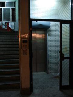 我待在電梯內,停在外頭黑暗的五樓,心慌的注視著所有按鈕,不斷嘗試著按著…突然門打開了!門口沒人,但有光亮,我略略探頭一望,有戶人家點亮了燈,一個老伯在作操。