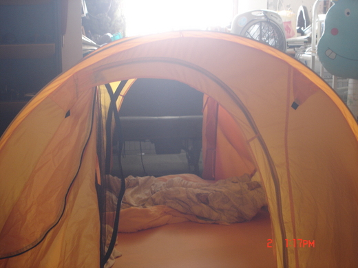 今天白天都沒有志工服務,我吃完brunch以後,繼續死心塌地的鑽進Easy Camp(快速張開帳篷)睡覺,帳篷搭在不時有海風拂過的客廳通道上(這是住左營軍港附近,在夏季特有的福利)。