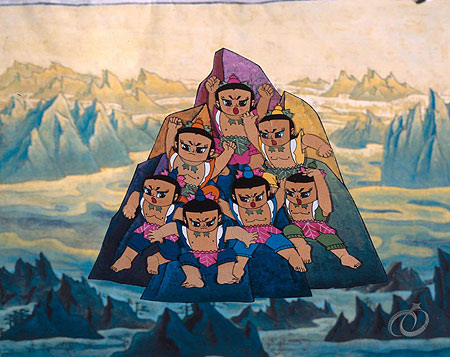 這七個兄弟會吃又會長,很乖又團結。很快地,就長得很大了,而且各有不同的本領:大兒子叫力氣大,二兒子叫刮大風(會吹大氣),三兒子叫皮很硬,四兒子叫不怕熱,五兒子叫竹竿腿,六兒子叫肚量大,七兒子叫大腳丫。
