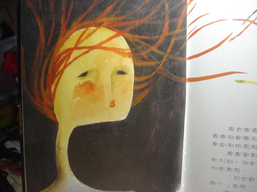 風也把媽媽的頭髮吹了起來,小女孩說:「媽媽好漂亮啊!」媽媽笑著幫忙倒牛奶,沒有說小女孩是不是也很漂亮。小女孩問:「為什麼那麼多雲還不下雨?」媽媽說:「太久沒下雨了,雲可能忘了怎麼下雨。」