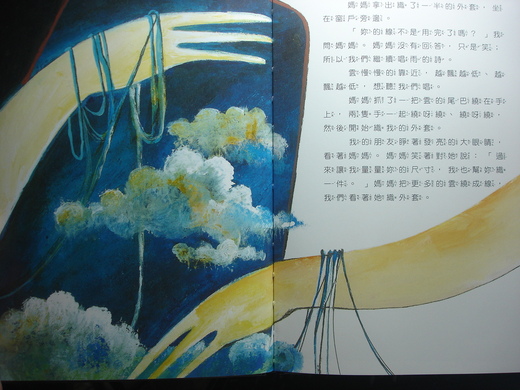 這時,雲慢慢靠近,愈靠愈近,想來聽雨的詩。媽媽順便將雲也抓進來織在外套上,要幫兩個小朋友各織一件外套。小女孩和朋友唸累了,先吃點橘子,休息一下後,繼續大聲唸,愈唸愈大聲,愈唸愈快,同時還用腳打拍子,又開始跳起舞來!