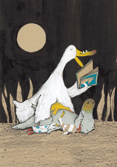 鴨媽媽教他們划水、跳水和走路(一起來做做看吧),Guji Guji 總是學得快又好,長得也是大又壯,雖然他長得不一樣,但是鴨媽媽都一樣地愛,晚上睡覺前還為他們說故事(就是封面那張圖;為什麼鴨媽媽看不出來呢?你覺得她知不知道?為什麼她會一樣愛和照顧?)