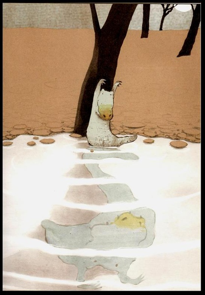 有一天,湖裡出現三隻很像 Guji Guji 的動物,露著大尖牙笑著,因為他們看見 Guji Guji 像鴨子一樣地走路。他們說:「看哪,有隻笨鱷魚在學鴨子走路。」Guji Guji 大叫:「我不是鱷魚,我是鴨子。」三隻鱷魚就說:「你沒有羽毛、扁嘴和大腳,但是你有藍綠皮、大尖爪和大尖牙,還有一身壞鱷魚的味道,就和我們一樣!藍綠皮可以躲在水裡,不被鴨子發現,大尖爪可以抓住鴨子,大尖牙可以吃掉肥美的鴨子…真是太美味了!我們知道你和鴨子住在一起,明天你就帶他們到橋上來跳水,讓我們在橋下張著嘴、等著吃吧,嘿嘿嘿~」Guji Guji 問:「我為什麼要聽你們的?」三隻鱷魚說:「因為我們都是鱷魚啊,要互相幫忙!」Guji Guji 好難過,他獨自待在湖邊,他覺得自己是鴨子,不是壞鱷魚,他對著湖面故意做一個很兇的動作,但映在湖面上的樣子好好笑,一點都不兇,讓 Guji Guji 笑了起來,他知道自己是什麼了,他是鱷魚鴨。(你覺得 Guji Guji 會不會幫壞鱷魚去害鴨子被吃掉?當然不會啦)Guji Guji 想啊想的,終於想到好方法了;當然,三隻鱷魚一晚上都在想著吃到美味的鴨子。