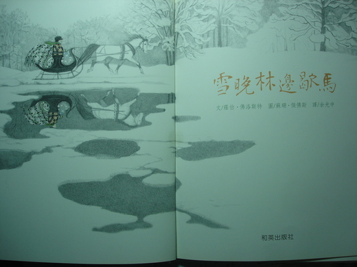 下著雪的傍晚,一匹白色的馬拉著雪橇,載著牠的主人,在雪地上前進,經過了湖邊(湖水映出了他們的倒影,為什麼湖水沒有全部結冰呢?),又進入了密密麻麻的森林(你覺得他們會不會迷路呢?),駕著雪橇的主人心裡想著:我想我認得這座森林,這片森林是有主人的,那位主人的房子就在前面村子裡;雖然那主人的家就在前面,但是他不會看到我在森林裡歇馬(意即:停下馬來),在看著他森林中飄滿白雪的景色(為什麼主人看不到呢?沒在看、看不清楚、聽不到或沒注意?╱駕雪橇的人年紀大嗎?是老伯伯╱有沒有看到一隻圓圓胖胖的鳥?貓頭鷹)。