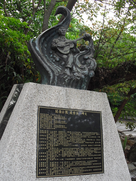 日前,參加高雄市原民會在關仔嶺舉辦的文化研習課程,清晨拜訪了附近公園的[吳晉淮廣場],看到環繞吳晉淮藝術銅像的一圈地面上,刻著[關仔嶺之戀]的歌詞及五線譜,我想,這樣的呈現,真是人與歌與土地的具體結合啊。