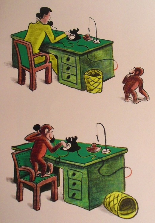 有一隻小猴子,總是非常好奇,他叫做喬治(名字當然不是他自己取的啦,那是誰幫他取的呢?是一位後來照顧他的好朋友取的),他原來住在非洲森林裡,有一天,有位戴著黃色大帽子的男人(我們稱他「黃帽子先生」吧)到非洲旅行,看到樹上這隻小猴子,就好喜歡哦,想要帶小猴子回家,黃帽子先生把他的黃色大帽子丟在樹下(作什麼呢?引誘小猴子下來),果然,小猴子非常好奇,就爬下樹來,看那頂大帽子(你猜小猴子會做什麼?),小猴子拿起大帽子就往頭上戴下去!因為帽子太大了,小猴子頭都被罩住,完全看不見,於是就被黃帽子先生用大帽子一包,就抓住了。