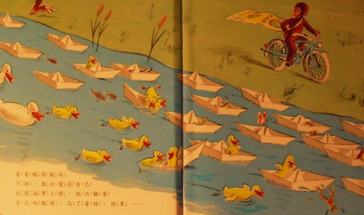 當送完街道這一邊的報紙以後,喬治看見遠處有條小河,覺得很好奇,所以就繼續往前騎。喬治看見河邊有人在釣魚,有人在玩小船,還有母鴨帶小鴨在游泳。喬治心裡面一直想著河上的小船,突然,他想到一個好玩的了…喬治停好腳踏車,開始用還沒送出去的報紙來摺小船,接著,又決定再多做一些小船,所以把報紙都拿來摺小船,成為一支大艦隊,然後就在河邊舉行小船下水典禮!
