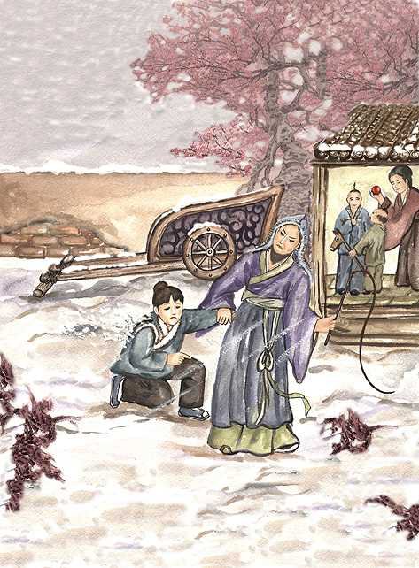 這時候,閔子騫突然在爸爸面前跪了下來,請求爸爸不要生氣,並且對爸爸說:「請爸爸千萬不要趕媽媽走,媽媽如果在,最多只有我一個人會孤單受罪,但是如果媽媽走了,那弟弟和我三個人都要受寒受凍了!」爸爸聽他這麼一說,非常感動,就讓新媽媽留了下來;而新媽媽也知道自己真的是做錯了,非常感謝閔子騫,從此以後,對待閔子騫就像親生兒子一樣地疼愛了。