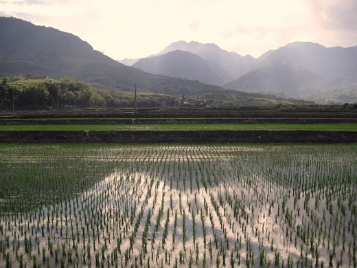 六點半和「信號ㄎㄚㄟ厝」民宿女主人合影後出發,走了1公里多,決定繼續順著自行車道走,因為在富源車站以後,還是會再接上台9線。沒想到,就此走上了一條超過5公里的超優道路,和台9線脫離而獨立發展,非假日時,一輛自行車都少見,似乎都可以低著頭瞇著眼,傻傻地看著地上的黃線,就可以安全地走上1公里;鋒面通過,氣溫下降,好像走在冷氣房內,加上厚厚的雲層遮閉了陽光,走起來實在是爽快。