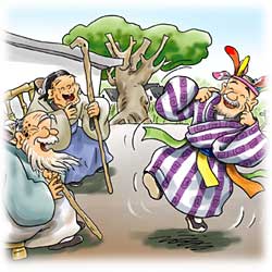 老爸媽一看到老萊子,一下子還認不出來他是誰呢:「咦?老伴哪,這個大娃娃是誰啊?」老媽媽看了一會兒才認了出來:「亥唷~這不是我們的兒子嘛!差點兒都認不出來啦!」這時老萊子也說話了:「爹~娘~孩子給您挑水來啦!嘿后,嘿后,嘿后!」突然,老萊子假裝一不小心滑了一跤,「碰!」的一聲,摔倒在地上,水也灑了一地,然後就開始像個孩子一樣哇哇大哭了起來:「哇~哇~哇~」老爸老媽看到楞了一下,接著就哈哈大笑了起來:「哈哈哈哈,他在裝孩子呢!哈哈哈哈~」兩位老人家都被老萊子逗得開心極了,而老萊子的心裡也覺得好快樂哦!