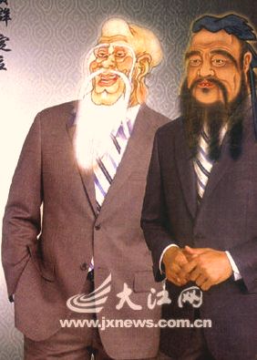 (開場引發動機:你看這張有趣的穿西裝圖片,你知道誰是孔子?誰是老子?你知道孔子和老子有什麼不同的地方?這兩位有大智慧的思想家曾經見過面哦,他們的會面有哪些有趣的故事呢?請聽「孔子拜會老子」的故事。)
