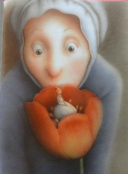 老婆婆將這顆種子種在小花園裡,好神奇哦,還沒過多久呢,這顆種子就長成了一株好美好美的鬱金香,眼看著花苞就要開花了,老婆婆高興地親了一下花苞,突然,「叮鈴鈴鈴鈴鈴…」,聽到一陣風鈴的聲音,花就開了。天啊!在花朵上坐著一位好可愛的小女孩,真的好小好小好小喔~只有一個拇指麼大而已,老婆婆覺得這個小小小小的小女孩好像是一個小公主哦,所以就叫她「拇指公主」。老婆婆為拇指公主準備的小床是個核桃殼,而蓋的被子是鬱金香的花瓣,有時候也會在桌上放一盆水,讓拇指姑娘坐在花瓣裡玩划船,任何人都可以看得出來,老婆婆真的好愛拇指公主喔。