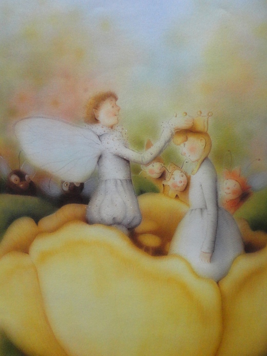 當拇指公主還在看得眼花潦亂的時候,背後傳來一個聲音:「妳是誰啊?」回頭一看,在另一個花朵上,有位帥帥的男生,和她一樣長得小小的。拇指姑娘說:「我是拇指公主,那你是誰呢?」帥帥的男生說:「我…我是花朵精靈王國的王子。」很快地,拇指公主和王子就變成好朋友了,王子送給拇指姑娘一對翅膀,並且帶著拇指公主在王國裡遊玩,到了第二年的春天,拇指公主就答應和王子結婚了,從此以後,他們就一起過著幸福快樂的日子了~