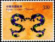 各位親愛的大朋友、小朋友,大家新年快樂!我是胖叔叔,肥滋滋。今天是中華民國一百零一年的元旦,在這新年的第一天,胖叔叔要連續為大家說五個關於「龍」的郵票故事,為什麼呢?因為,龍年要來啦,所以胖叔叔當然要來說說「龍」的郵票故事啦!我們中華郵政公司為了迎接新年,都會發行當年的生肖郵票,所以在去年的十二月就發行了三張龍年郵票,郵票的圖案採用了新藝術的自由普普風概念,除了有象徵自然的綠色,還有代表高貴的紫色,而圖案的背景也巧妙地運用了傳統的中國潑墨藝術風格,色彩繽紛又明亮,呈現出龍年歡欣與喜悅的氣氛。其中第一張是面額3塊5的郵票,圖案是兩隻龍在互相對望,非常地相親相愛,代表著「擁有」,同時也象徵了「如意呈祥」的祝福味道哦。