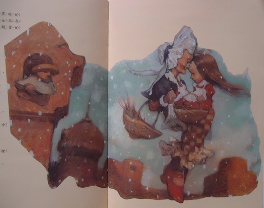 趕快,小女孩再擦亮一枝火柴,「ㄘ~」,「喔,我看到一棵好漂亮的聖誕樹哦!」聖誕樹上掛了好美麗的燭火和好多好玩的玩具,當小女孩想要去拿玩具的時候,火柴熄掉了,聖誕樹和所有的玩具又都不見了,而美麗的燭火好像變成了天上的星星…,突然,有一顆流星掉了下來,小女孩想起奶奶對她說:「天上一顆星星掉下來,就會有一個人升到天堂去。」「ㄘ~」,小女孩再擦亮一枝火柴…「蛤?我看到…我看到了奶奶耶!」小女孩看見奶奶慈祥又美好的笑容,好高興哦,小女孩說:「奶奶,我好想你,我好冷,你帶我走好不好?」只是,當火柴熄滅之後,奶奶又消失不見了,為了要再看見想念的奶奶,小女孩不停地擦亮一束一束的火柴…於是,火柴的光亮愈來愈亮了,愈來愈大了,矇矓中,小女孩好像看見最愛她的奶奶張開了雙手,輕輕地把她抱了起來,一起飛向一個快樂的地方,那裡不會挨餓,也不會再受凍了…