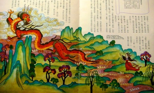 找了好久好久,最後才看到小吉趴在岷江邊,正痛苦地大口大口喝著江水呢。急得小吉媽媽邊跑邊喊:「小吉,小吉,你怎麼啦?你哪兒不舒服啊?」小吉聽見媽媽的呼喚,回頭看著媽媽,這時,媽媽才發現小吉頭上竟然長出好像鹿角的東西,同時嘴巴也正在慢慢地拉長,越來越像馬嘴了!小吉不停地喝水,好像要用水來澆熄肚子裡的烈火!而小吉的身體繼續不斷地扭曲、變形、加長,同時還長出了魚鱗片和四隻帶爪的大腳!媽媽簡直不敢相信:「小吉,你不要嚇媽媽,你快變回來吧!」可是小吉變不回來了,小吉已經變成了一條巨龍了,而且隨著江上的雲霧開始緩緩飛向天空了。媽媽急得大喊:「小吉,小吉,你不要走~」媽媽不停地喊著小吉,而巨龍也不斷地含淚回頭,巨龍每回一次頭,岷江的水道就被打出一個彎,就這樣,巨龍共回頭看了24次,也把岷江打出了24個彎,最後,巨龍消失在九霄雲裡,再也不能和媽媽在一起,當地人為了紀念這個感人的故事,就把這72個彎稱為「望娘灘」了。