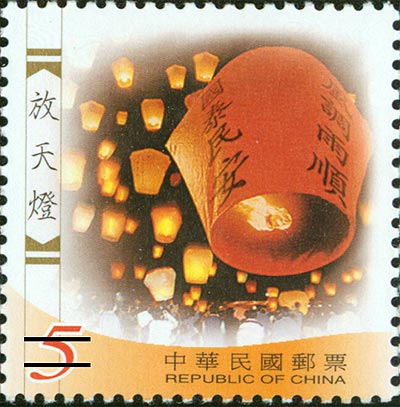 各位親愛的大朋友、小朋友,大家早上好!我是胖叔叔,肥滋滋。再過一天,就是農曆正月十五的元宵節了,而放天燈則是元宵節很有特色的一項地方民間習俗,早期是為了在交通不便的時代,藉著放天燈來互報平安,而流傳發展到今天,放天燈已經成為著名的祈福儀式,只要在燈上寫下心中的願望,再看著天燈緩緩升空,就彷彿美夢將要成真,而看到夜空中,盞盞天燈就像點點明星,實在是又美好、又祥和,而這樣的景觀也成為郵票的圖案了!中華郵政公司在民國九十一年發行的「台灣民俗活動郵票」當中,就有一張面額五元的「放天燈」郵票,郵票圖片上看到的是夜空中冉冉上升的美麗天燈,其中最大的那盞天燈上寫著「國泰民安,風調雨順」八個大字,這正是我們所有人心中深深的期盼啊!