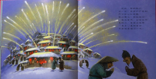 天黑了,海水嘩啦嘩嘩啦地波動了起來,年獸從海裡站了起來,開始一步一步地向村子前進。在安靜的黑夜裡,突然,年獸聽見對牠來說很刺耳的聲音:「鬥鬥鬥鬥,鬥鬥鬥鬥!」(是什麼聲音呢?剁餃子餡)年獸很不喜歡這個聲音,生氣地大叫:「吼~」丁婆婆聽見年獸的吼聲,好害怕,剁得更快了:「鬥鬥鬥鬥鬥,鬥鬥鬥鬥鬥!」年獸好痛苦啊:「啊~啊~呃~難受死啦~」就在這時候,老人將竹子尖點著了火,竹子被火燒到爆裂,發出「霹靂帕啦,霹靂帕啦」的聲音,老人拿著燒得爆裂的竹子,在雪地上跑來跑去,年獸看見老人身上的紅布和竹子的火光和爆裂聲,嚇得把眼睛閉得緊緊地,原來啊,年獸最怕就是吵鬧聲、火光爆炸和紅色了。(你覺得爆裂地霹靂帕啦的竹子會讓你想到什麼東西?披著紅布跑來跑去又像是在什麼東西在舞來舞去?)年獸實在受不了了,在地上滾來滾去:「好難過啊~我受不了啦~」接著趕快逃回深海裡去睡覺了。老人告訴丁婆婆:「年獸逃走了,你們可以安心了!」說完,老人咻的一聲飛上了天,原來他是位仙人啊。