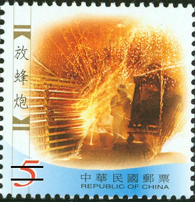各位親愛的大朋友、小朋友,大家早上好!我是胖叔叔,肥滋滋。農曆年節已經過去了,但歡樂的年味相信仍然是暖烘烘地留存在我們的記憶中。今天胖叔叔想要讓大家再回味一下過年時的一項傳統民俗活動,好為年味留下一個美好的句點。到底是什麼活動呢?在上次的郵票故事中,介紹了「放天燈」郵票,而今天呢,要來介紹的就是同時發行的「放蜂炮」郵票,發行時間也是在民國九十一年,面額是五元。放蜂炮是台南鹽水的傳統民俗活動,小朋友,你知道為什麼要放蜂炮呢?相傳是在清朝光緒年間,鹽水地區流行病的疫情非常嚴重,因此當地居民就恭請關公等神明出巡來驅趕瘟疫,而沿途的民眾紛紛燃放炮竹煙火來助威,結果疫情真的就絕跡了,後來鹽水居民每年的農曆正月十五日元宵節都必定恭請關老爺繞境,並爭相燃放鞭炮,就這樣,形成了鹽水蜂炮的傳統民俗活動。當蜂炮施放時,萬發齊放,蜂鳴大作,實在是非常地瘋狂刺激,而這張「放蜂炮」的郵票圖案上,正是呈現了蜂炮施放時的精采熱鬧畫面。