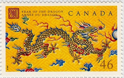 各位親愛的大朋友、小朋友,大家早上好!我是胖叔叔,肥滋滋。今天要來介紹一張外國的龍年郵票,這張龍年郵票是加拿大在西元兩千年,也就是在千禧年發行的,郵票圖案是一隻尊貴的五爪金龍正在騰雲飛翔的畫面,背景是尊貴的金黃色,一看就讓人想像到皇帝龍袍上的金龍,可以說充分展現出龍在華人文化中的祥瑞和尊崇地位,由於千禧年剛好碰上龍年,而華人的足跡又遍及四海,所以那年有許多國家都發行了龍年郵票,像是加拿大也有許多華人落腳定居,因此加拿大就發行了這張華麗的龍年郵票作為千禧龍年的慶祝紀念。