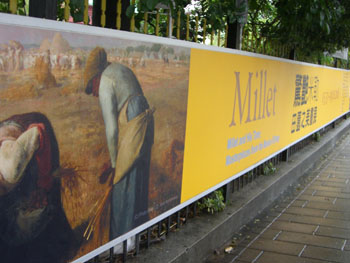 外頭下著颱風天的陣雨,撐著傘在歷史博物館排著隊,一步步的順著人龍前進,想不到在周四的下午竟然還有這樣多的參觀人潮,為的就是米勒知名畫作「拾穗」和「晚禱」為首的「巴比松畫派」展覽。這兩件世界名畫,被法國視為國寶,從來不同時出借,若不是因為奧塞美術館的米勒廳將要整修,還得飛到法國才能一覽風采。若以此魅力才看,現場的許多家長帶著小朋友來看展覽,也不足為奇了!不過頂著雨傘排了約半小時的隊伍,尤其在這週四需要上班的時刻,還真是讓我始料未及。