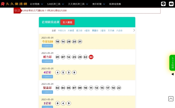 全台更新最快的539開獎就在這!同步電視轉播~不僅只有五三九,大樂透即時開獎號碼,天天樂開獎,三四星彩開獎都有拉~趕緊鎖定539gdf99網讓一站超多用途~還有熱情小編一對一教學539玩法,以及免費提...