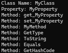 internal class Program{ static void Main(string[] args) { // 獲取類別型別資訊 Type type = typeof(MyClass); Console.WriteLine("Class Name: " + type.Name); // 列出所有屬性 foreach (var property in type.GetProperties()) { Console.WriteLine("Property: " + property.Name); } // 列出所有方法 foreach (var method in type.GetMethods()) { Console.WriteLine("Method: " + method.Name); } // 暫停 Console.ReadLine(); }}