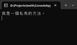 class MyClass{ //私有方法 private void PrivateMethod() { Console.WriteLine("我是一個私有的方法。"); }}