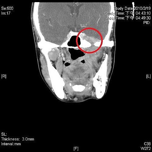 頭部電腦斷層掃描的正面圖。紅圈處為鼻咽癌已侵入腦底部