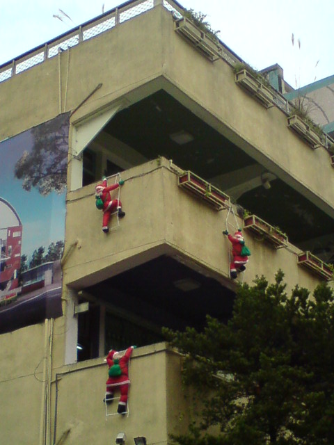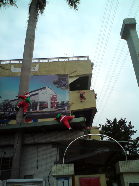 聖誕節將至,在眾多商業裝置裝飾之外,平靜的校園乍見聖誕老公公慢慢爬進房子裡,如此眼見,本將悄悄進行的送禮之行,在光天化日下也無法低調了,如此趣味這般的聖誕。而另一校園,將馬槽佈置得精美,但其中獨缺主角,一想之下,原來這只是預告,真正的事件將象徵地於25日,隨著嬰兒玩偶的置入而發生,精美裝置也必需在延續的互動中完成,這些是校園獨特的聖誕預示方式。