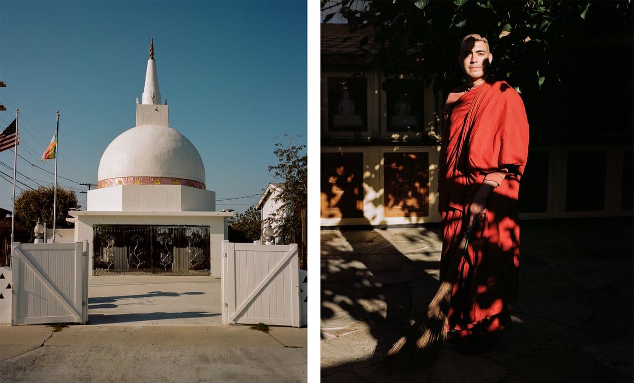左圖:位於北好萊塢的薩拉斯坎德拉佛教中心,許多新成員是年輕的拉丁美洲人。右圖。薩納塔維哈裡法師站在寺廟的院子裡為人畫像。