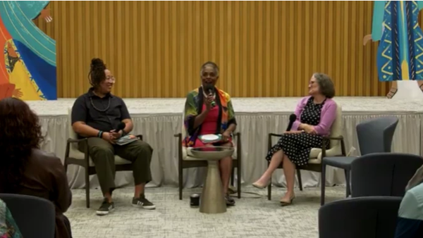 Cheryl "Ras" Tuesday(左)牧師 Jacqui Lewis 博士和牧師 Shannon Daley-Harris 博士在紐約九月的一次活動中討論《正義愛情故事聖經》。 |截圖/YouTube/Middle Church