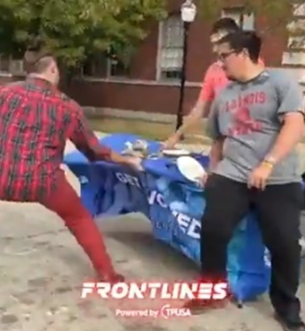 伊利諾伊州立大學一名助教因在校園內掀翻「美國轉折點」學生分會的桌子而於上週被捕並被解除職務。