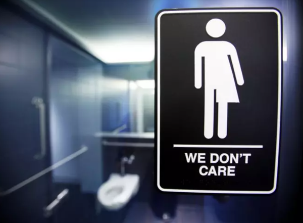 2016年5月3日,在北卡羅來納州達勒姆市的21C博物館酒店,一塊抗議北卡羅來納州近期一項限制跨性別者使用衛生間的法律的標語牌裝飾著衛生間的隔間。(路透社/喬納森德雷克攝)