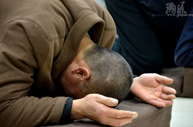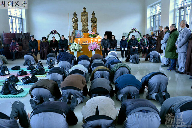 25/40全體發心出家者向各自到場或未到場的父母頂禮拜別。佛門詩偈云:「流轉三界中,恩愛不能脫,棄恩入無為,真實報恩者。」(圖片來源:溯源佛教網)