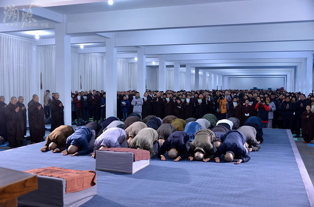 21/40發心出家者頂禮得戒和尚和出家阿阇黎(「阿阇黎」為梵語,意為「教授師」)。剃度儀式現場,現場約2000信眾參加剃度儀式。(圖片來源:溯源佛教網)